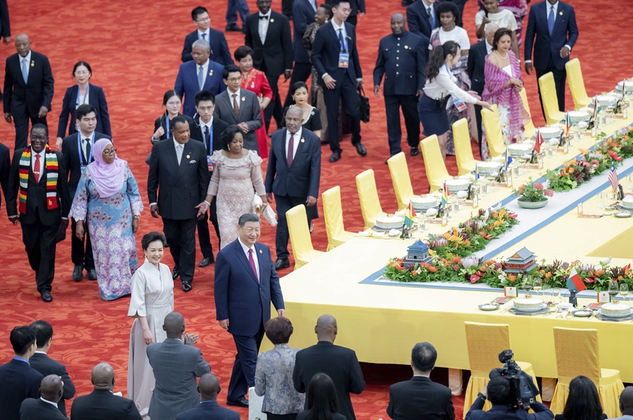 華燈初上,人民大會堂北大廳燈火輝煌。紅毯鋪就,中國國旗和50多面非洲國家國旗以及非洲聯(lián)盟旗幟組成的旗陣恢弘大氣、熱烈奔放。