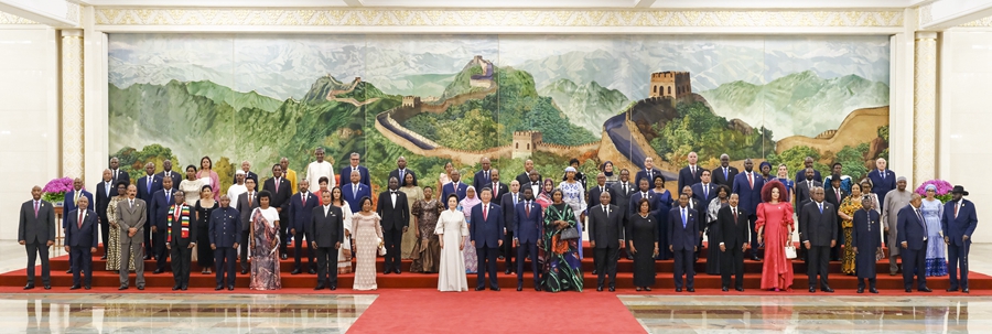 9月4日晚,國家主席習(xí)近平和夫人彭麗媛在北京人民大會堂舉行宴會,歡迎來華出席中非合作論壇北京峰會的非方及國際貴賓。這是宴會前,習(xí)近平和彭麗媛同貴賓們集體合影留念。新華社記者丁林攝